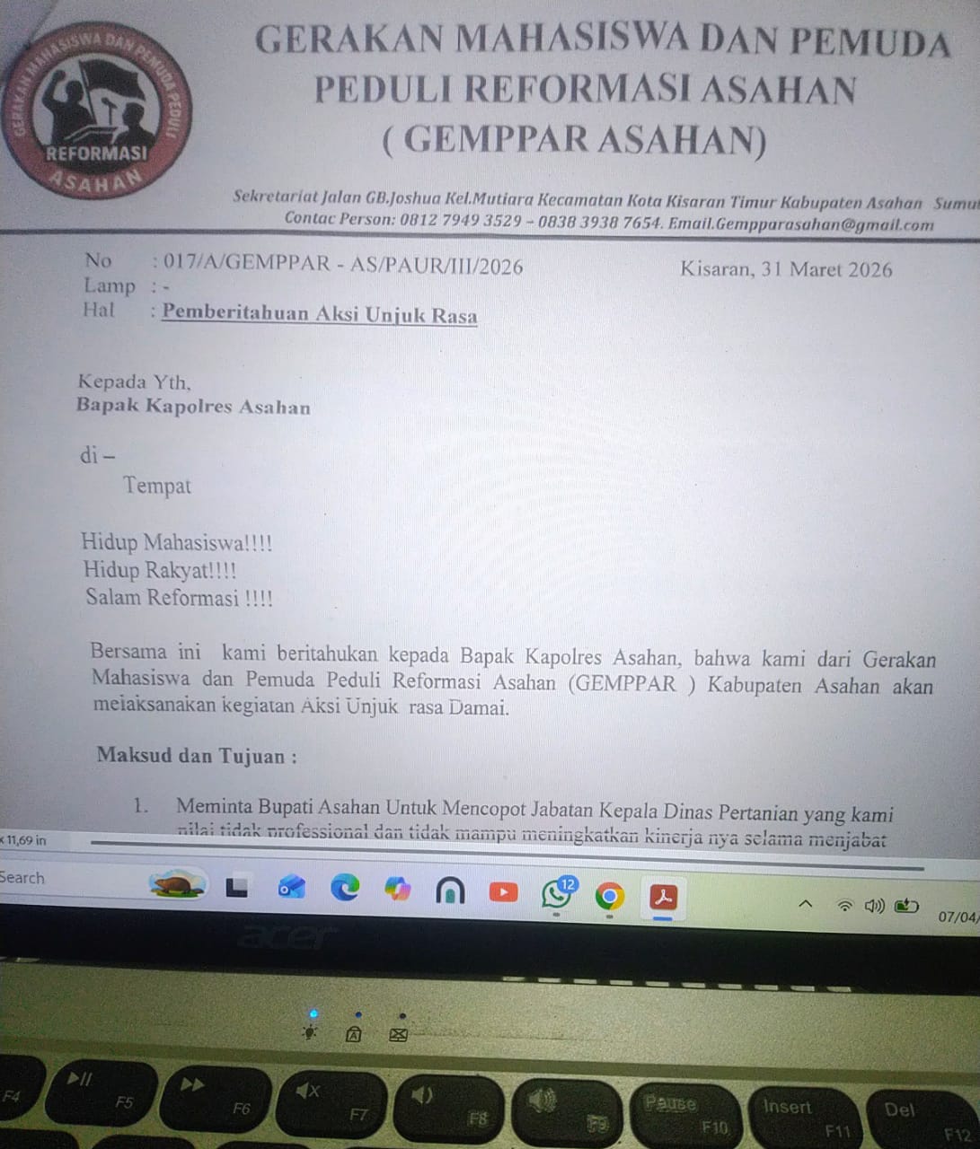 DIALOG BERITA, Kisaran – Gerakan Mahasiswa dan Pemuda Peduli Reformasi (GEMPPAR) Asahan melayangkan surat pemberitahuan aksi unjuk rasa damai kepada Kapolres Asahan. Aksi ini dijadwalkan berlangsung pada Selasa, 7 April 2026, dengan titik kumpul di Tugu Garuda UNA dan melibatkan sekitar 50 peserta. Demikian informasi yang diperoleh Redaksi dari personil GEMMPAR, hari ini di Kisaran.